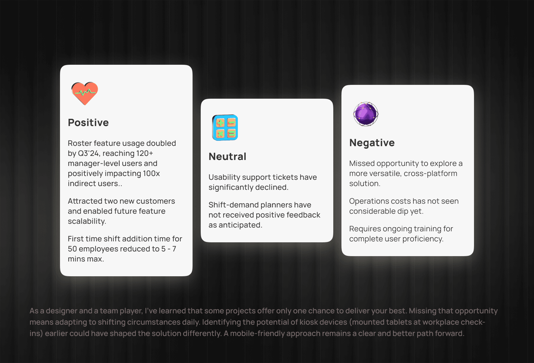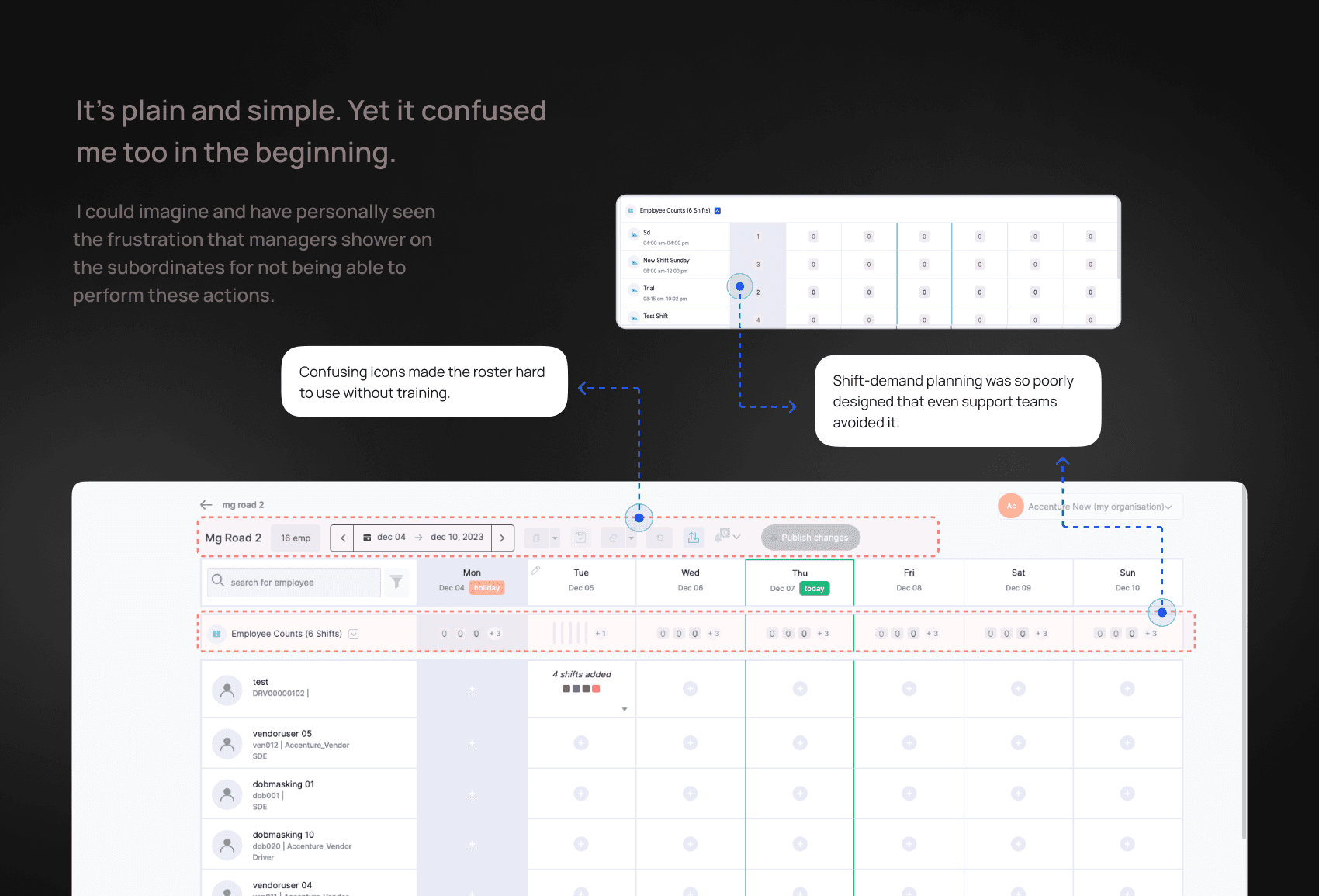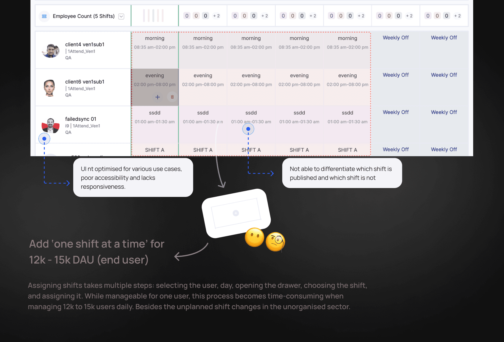 ▪️ 85% of client admins found the roster system too complex and time-consuming, prompting them to use alternatives like notebooks or Excel.