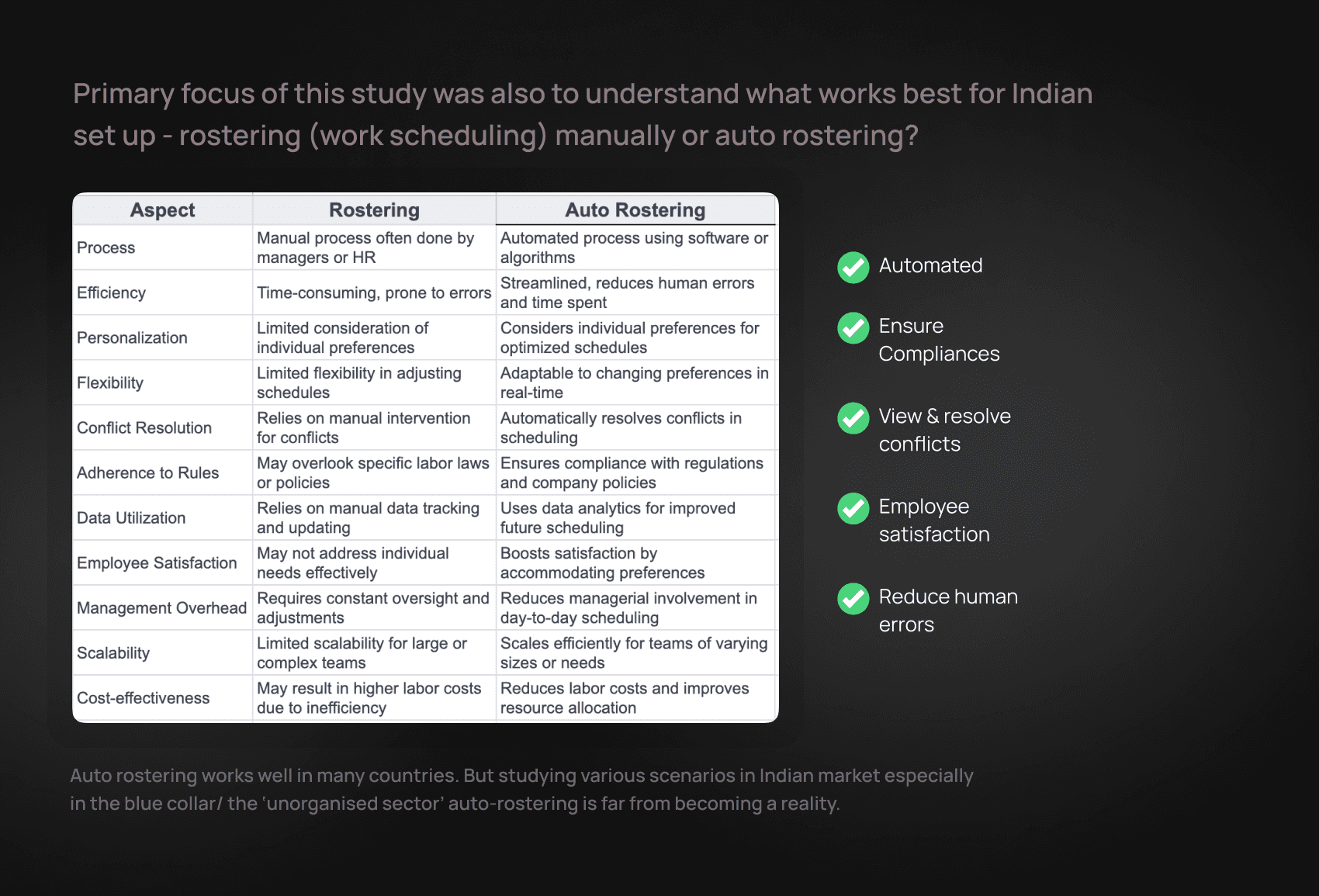 ▪️ Create a scalable, user-friendly rostering system with proactive feedback, seamless data integration, and region-specific adaptability (e.g. timesheets).